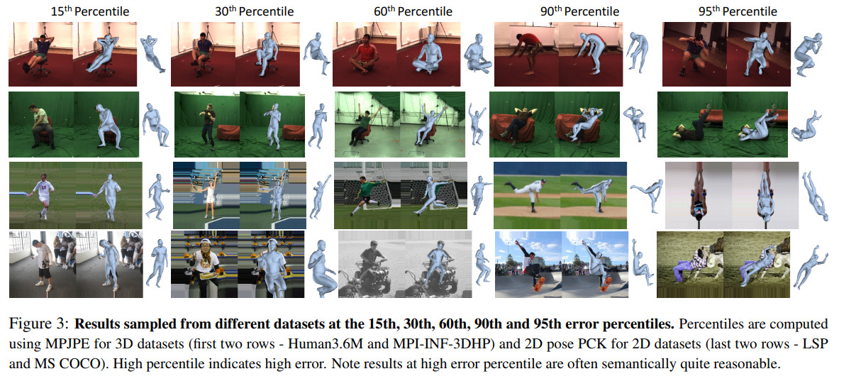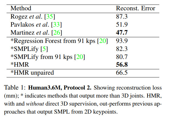 对于2D image dataset,作者使用了LSP,LSP-extended,MPII和MS COCO,训练数据量分别是1k,10k,20k和80k。2D image和3D dataset作者使用了Human 3.6M和MPI-INF-3DHP。而用作训练discriminator的SMPL真实数据是: CMU, Human3.6M training set 和the PosePrior dataset,训练数据量分别是390k,150k,180k。