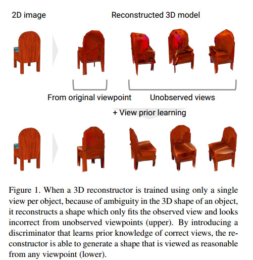 可以看到,对于椅子,使用作者提出视角先验的方法,重建的结果从各个视角看上去都更加符合实际情况。 基于这种情况,作者使用判别器来给生成器提供不同视角的重建信息。