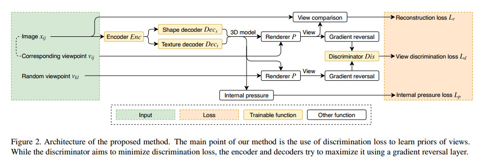 整个网络的输入为单张RGB的图片,生成器首先依据图片重建出一个对应的三维模型,再根据这张图片所对应的相机视角反投影回二维平面,获得的图片可以记为$x_{gt}$。接着,在从$\mathcal V$中选取任一与之前的相机视角不一致的的相机视角,并依据此相机视角,再一次投影会二维平面。这是,第一次投影所得的$x_{gt}$就可以当做真实数据,第二次投影所得就可以当做加数据,一同送入判别器进行判断。作者在文中提到,所有的视角都是存在于训练集中的($\mathcal V$ be the set of all viewpoints in the training dataset)。这是否意味着对于一些在训练集中不存在的视角,该网络还是难以学习到其形状?