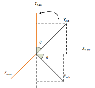 如果将向量(为了方便计算,这里将点表示为向量)和坐标系两者分离开,向量是独立于坐标系存在的。我们就可以将选择单独看作是坐标系的旋转,而旋转矩阵$R=[X_1, Y_1, Z_1]$中的每一列就表示原始坐标系的坐标轴在新坐标系下的投影长度。我们有两个坐标系$C_{new}$和$C_{old}$,且$X_{1} = \begin{bmatrix} \cos{\theta} & \sin{\theta} & 0 \end{bmatrix}^{T}$,则如下图所示:
